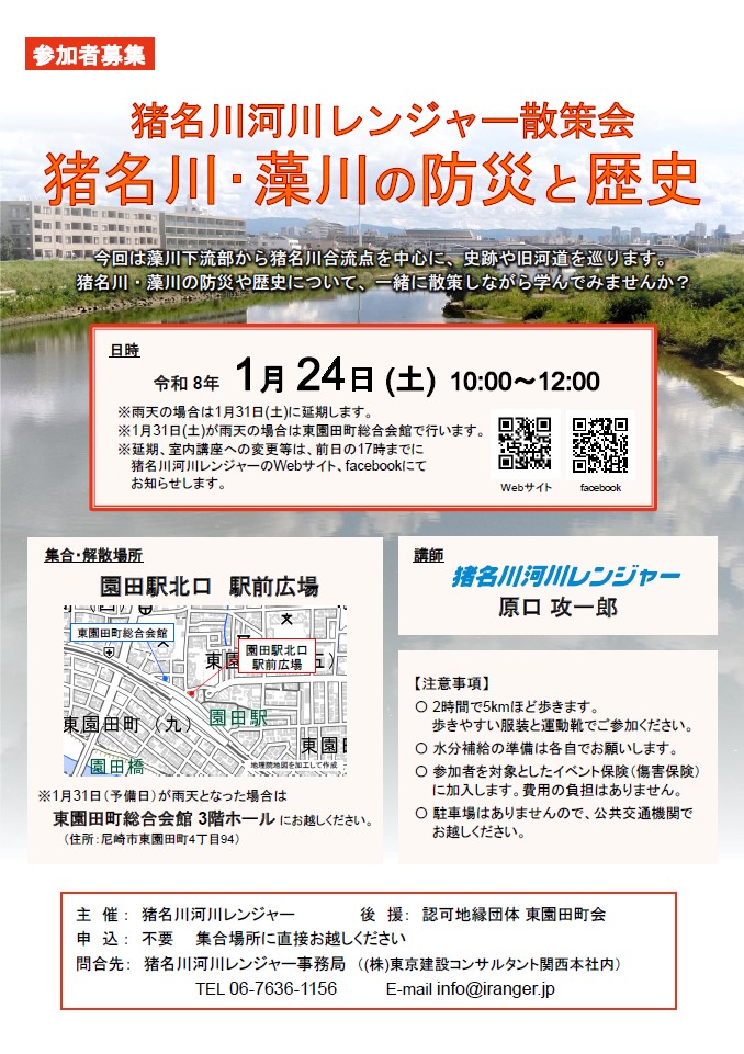 散策会「猪名川・藻川の防災と歴史」藻川下流部から猪名川合流点を中心に、史跡や旧河道を巡ります。猪名川・藻川の防災や歴史について、一緒に散策しながら学んでみませんか?