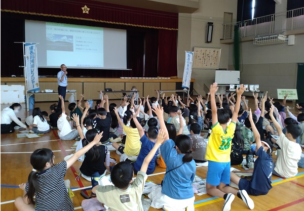 最初に、猪名川の概要や水質・生き物・ごみ問題等についてスライドで説明し、猪名川のことについて学んでいただきました。また、講義の後は、振り返りを兼ねて、猪名川に関する色々なことを出題した「猪名川クイズ」を行いました。児童の皆さんに積極的に参加してもらい、とても盛り上がりました。