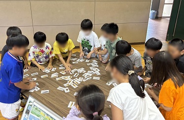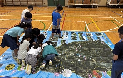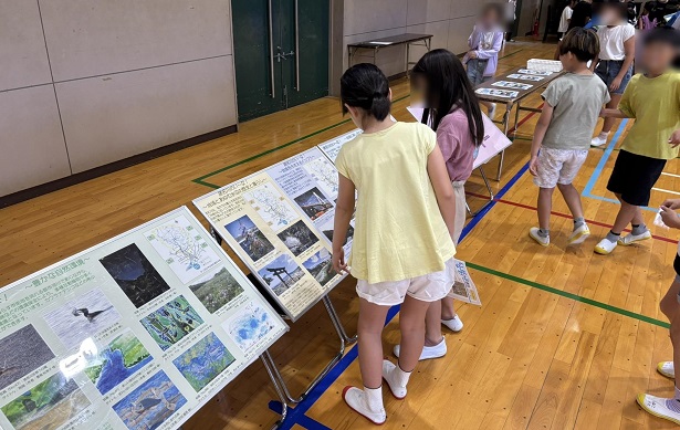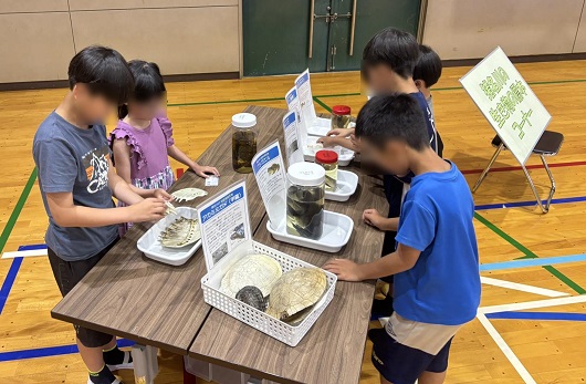 体育館の数か所に展示・体験コーナーを設け、児童の皆さんに自由に見学、体験しながら猪名川について学んでいただきました。生物標本に触れたり、ハザードマップ上で自宅の場所を探して洪水時における自宅の危険性を確認したりして、猪名川への関心を高めていただきました。