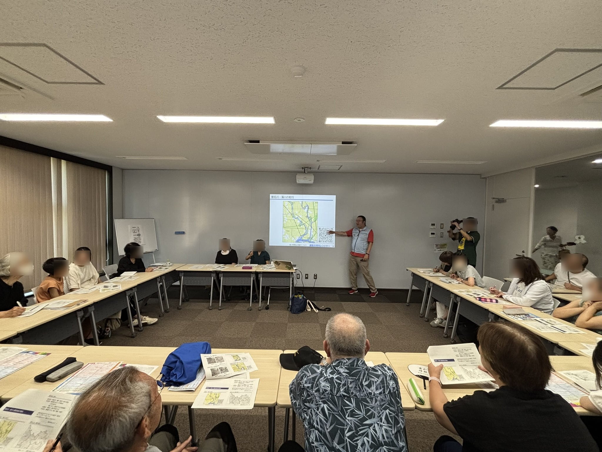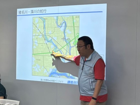 授業の初めに、猪名川河川レンジャーの役割や活動内容等について説明しました。続いて、猪名川・藻川の改修工事前後の河道状況や、園田地区の地名の成り立ち、園田地区の地形の特徴等、猪名川・藻川および園田地区の歴史を、地図を用いて解説しました。防災については、猪名川・藻川と武庫川のハザードマップを確認するとともに、ハザードマップを見る際のポイントや洪水の定義、防災に関わる言葉の意味等を解説し、防災に関わる正しい知識や情報を、参加者の皆さんと共有しました。授業終了後に実施したアンケートでは、参加者の皆さんから、「災害リスクを調べようと思った」「周りの人と防災情報を共有したい」との感想をいただきました。