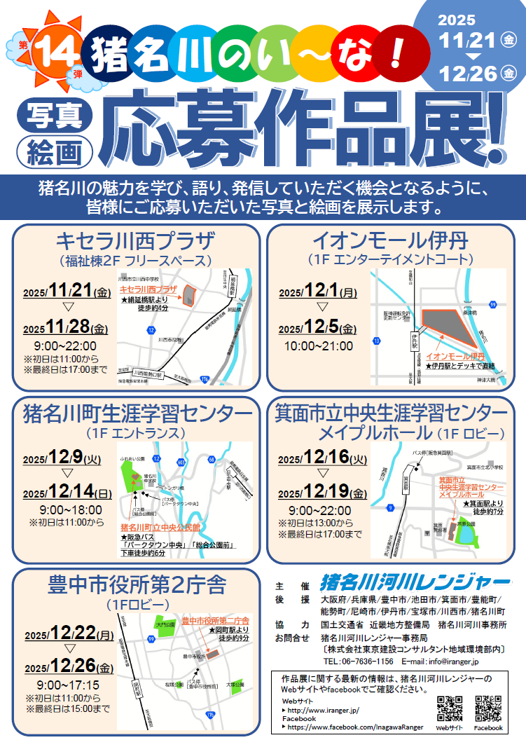 第14弾 猪名川のい~な!作品展「第14弾 猪名川のい~な!」にご応募いただいた写真、絵画の作品展を5会場で開催します。