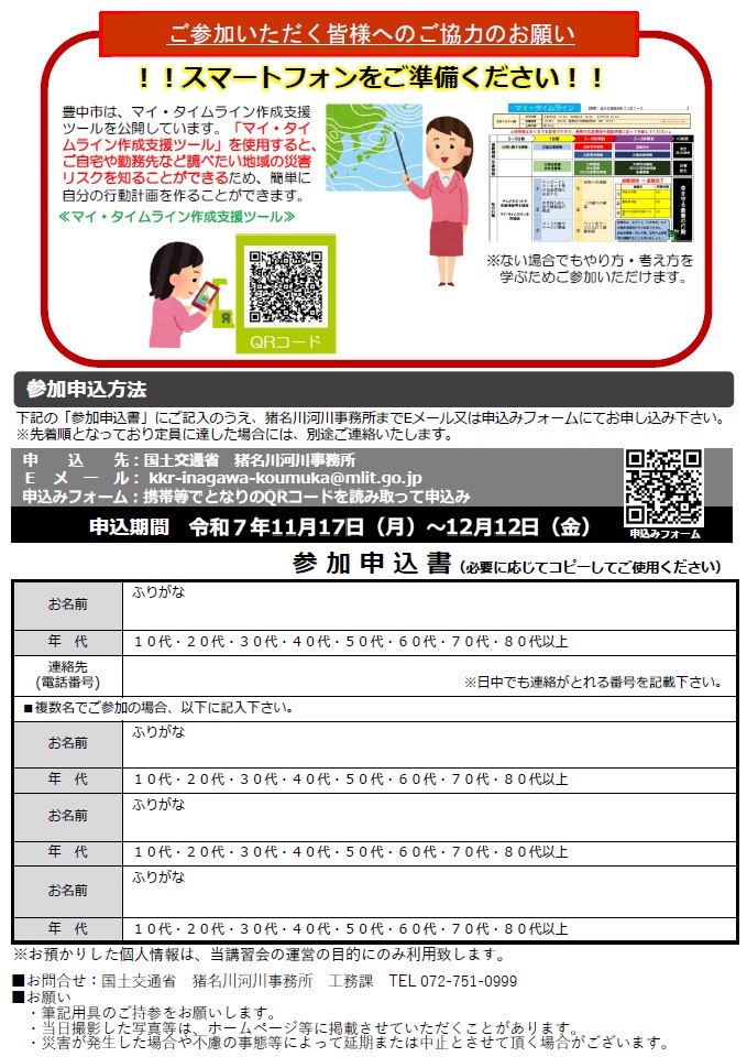 わたしの防災行動計画猪名川河川事務所と豊中市が主催するマイ・タイムラインの作成講座の講師を志築河川レンジャーが務めます。自分や家族を守るための「マイ・タイムライン(防災行動計画)」を一緒に作成してみませんか?