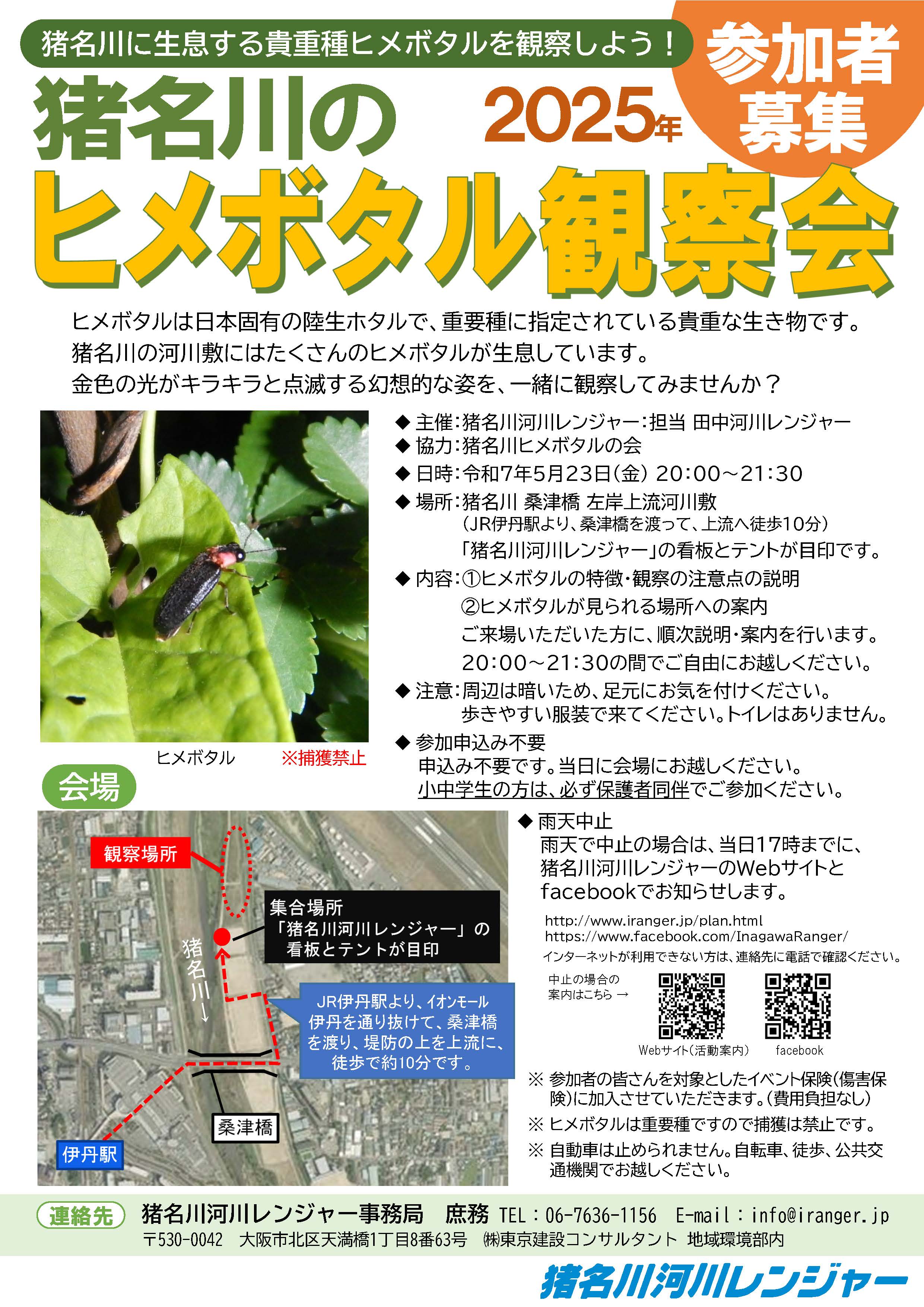 ヒメボタル観察会 ヒメボタルは日本固有の陸生ホタルで、重要種に指定されている貴重な生き物です。猪名川の河川敷にはたくさんのヒメボタルが生息しています。