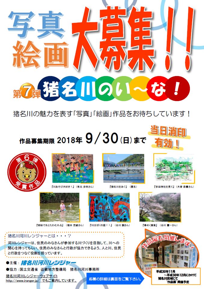 ・ 猪名川の魅力が表現されている作品を表彰します。 ・ "猪名川河川レンジャー賞""猪名川河川事務所長賞"各賞を数名程度 ・ 入賞者へは平成30年10月下旬を目途にお知らせします。 - 7. 応募作品の展示について