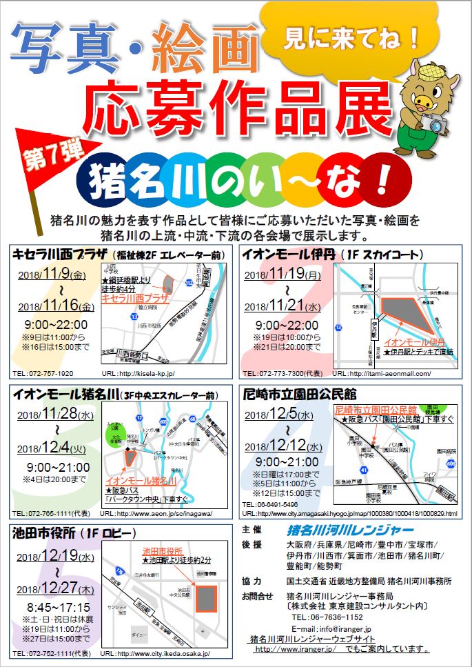 「第7弾 猪名川のい~な!」にご応募いただいた写真、絵画の作品展を開催します。流域の皆様が表現した「猪名川の魅力」をぜひご覧ください。作品展は川西市、伊丹市、猪名川町、尼崎市、池田市の会場で開催します。