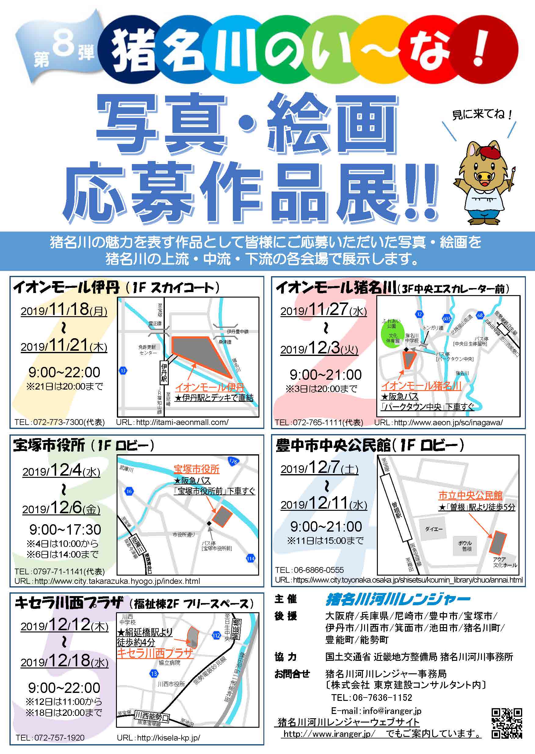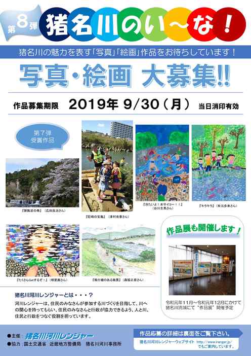 ・ 応募頂いた作品は、令和元年11月~12月の期間において、猪名川流域にある展示スペースにて展示する予定です。作品展の開催については、詳細が決まり次第、猪名川河川レンジャーのウェブサイトなどで案内します。 ・ 写真はA4サイズ、絵画は四つ切り画用紙で展示します。データで応募いただいた写真は、当方でA4サイズの用紙に印刷し、展示します。 ・ 作品を展示する際は現物を展示しますが、応募作品に破損、盗難など、万一の場合が生じても、当方は補償できませんので、あらかじめご了承ください。 - 8. その他