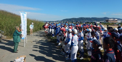 外来種駆除体験会には、会場となった軍行橋近くのグラウンドで練習や試合を行っている少年野球チームが8チーム参加し、選手・指導者を含めて総勢200人近い参加者によって行いました。
