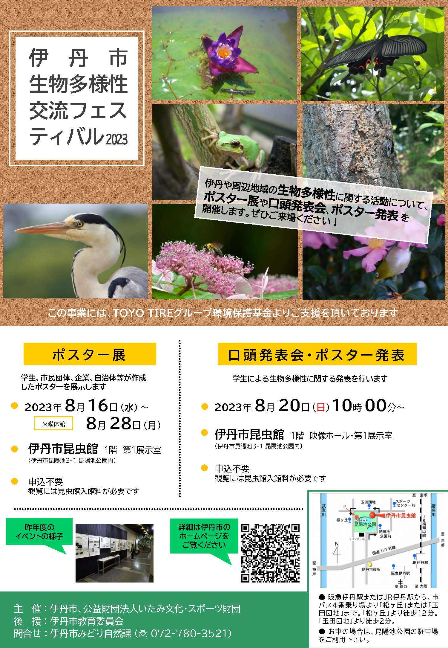 ■開催日 : 令和5年8月16日(水)~8月28日(月) ■場 所 : 伊丹市昆虫館 1階 第1展示室 ■参加団体 : 16団体 (2校、6市民団体、2企業、6自治体) |