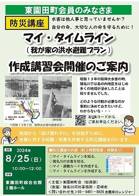 講座は、日本に接近中の台風10号のタイムリーな話題からスタートし、猪名川流域で起こり得る水害の危険について、写真やシミュレーション映像を用いて理解していただきました。そのうえで、猪名川・藻川の水害対策、ハザードマップの見方、猪名川河川事務所の対策等についてお話しました。また、水害への日頃の備えとして、各自がマイタイムライン(自分専用の防災行動計画)を作成しておくことの重要性と、作成方法を説明し、自宅で家族とともに作成していただけるよう呼びかけました。
