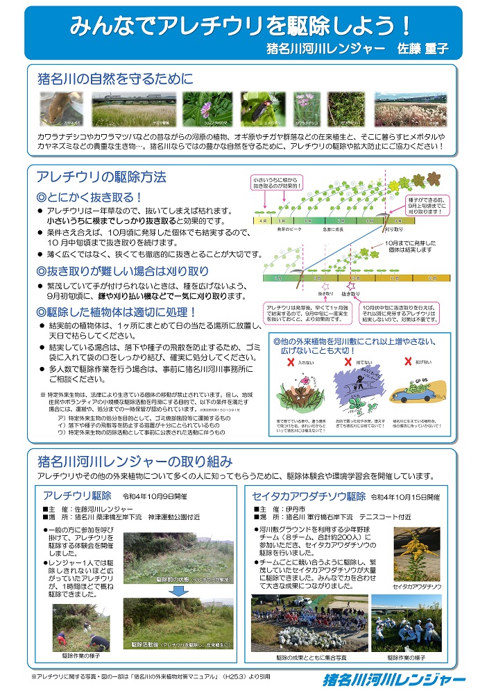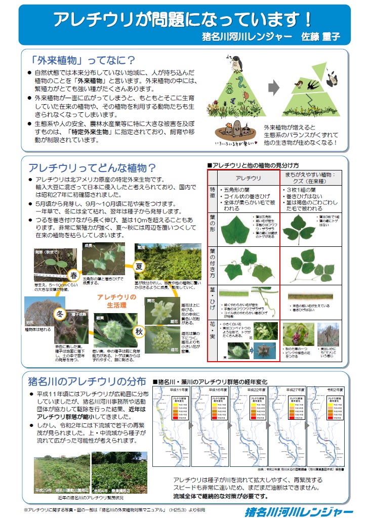 今年は、猪名川河川レンジャーの紹介のポスターと併せて、河川敷の自然を脅かす特定外来生物「アレチウリ」について皆さんに知っていただけるよう、アレチウリの特徴や問題、駆除方法等を紹介するポスターを出展しました。夏休み期間中のため、家族連れなど多くの方にご来場いただき、ポスターを見ていただくことができました。