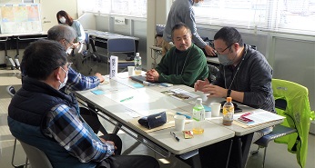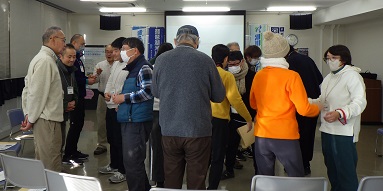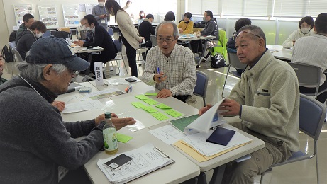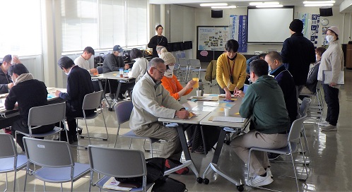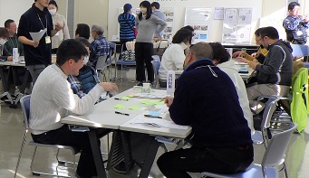室内に戻り、4テーブルに分かれてワークショップを行いました。一人ひとりが付箋に「河川や活動への要望・課題」と「それに対して行った活動の工夫」を書いて台紙に貼ってから、テーブル毎に1人1分で内容を発表し、お互いの河川レンジャー活動の状況について情報交換しました。