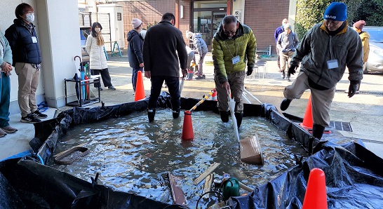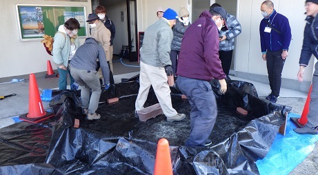実際に屋外で設営を見学すると、各パーツと防水シートの組み立てにより、短時間でキットが完成しました。そこに水を貯めて、実際の浸水時と同様にゴミや泥を混ぜると準備完了です。参加者が順番に浸水地歩行を体験し、浸水時の歩きにくさ、足元の見えにくさ等が実感できることを確認しました。
