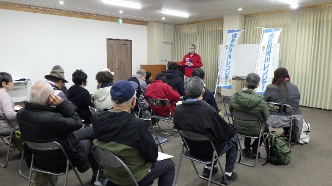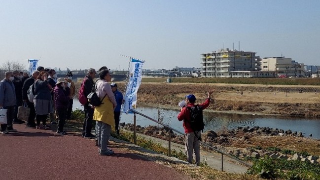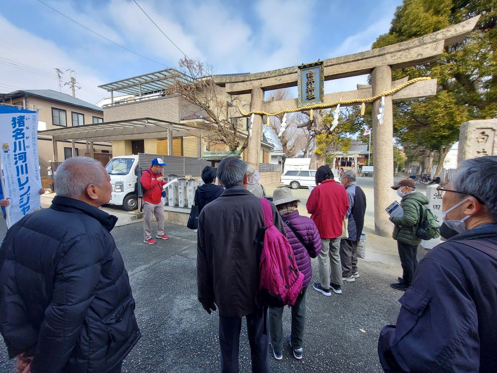 活動レポート尼崎市の東園田町会からのご依頼により、原口レンジャーが講師となって「猪名川・藻川の防災歴史散策会」を行いました。東園田町会の周辺地域は、猪名川と藻川に挟まれ、古くから洪水の被害が頻発する地域でした。近年は治水対策などによって被害は発生しておらず、洪水に対する地域の方々の記憶や体験が薄れてきています。そこで、地域に残された防災や歴史文化に関する史跡・記憶などを巡りながら理解を深め、東園田地域における防災の重要性と地域の歴史を再確認しました。