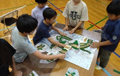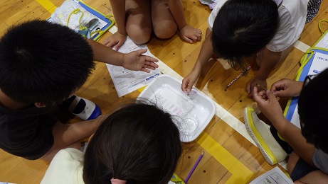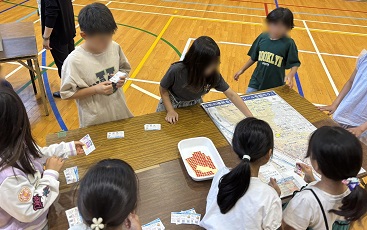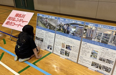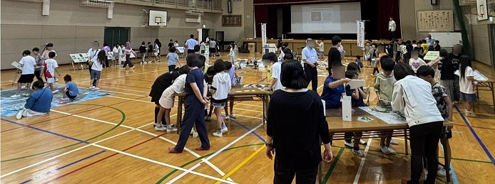 体育館の数か所に展示・体験コーナーを設け、児童の皆さんに自由に見学、体験しながら猪名川について学んでいただきました。生物標本に触れたり、ハザードマップ上で自宅の場所を探して洪水時における自宅の危険性を確認したりして、猪名川への関心を高めていただきました。