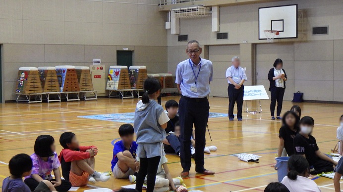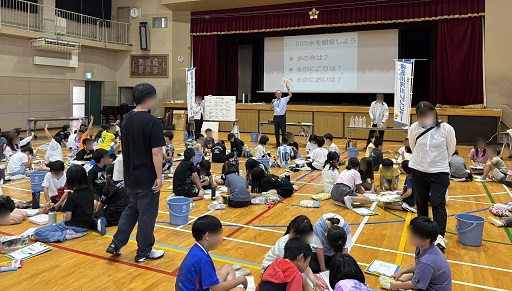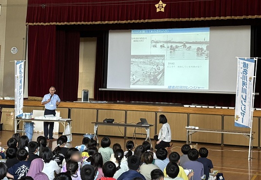 最初に、猪名川の概要や水質・生き物・ごみ問題等についてスライドで説明し、猪名川のことについて学んでいただきました。また、講義の後は、振り返りを兼ねて、猪名川に関する色々なことを出題した「猪名川クイズ」を行いました。児童の皆さんに積極的に参加してもらい、とても盛り上がりました。