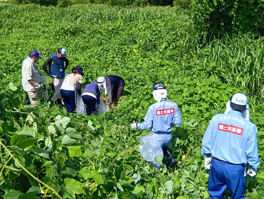 今回、実際に駆除活動を体験したいとの話を猪名川河川事務所が受け、事務所職員と一緒に、猪名川に繁茂する特定外来生物であるアレチウリの駆除活動を行いました。活動にあたっては、猪名川河川レンジャーや河川協力団体も参加し、四者共同の活動となりました。