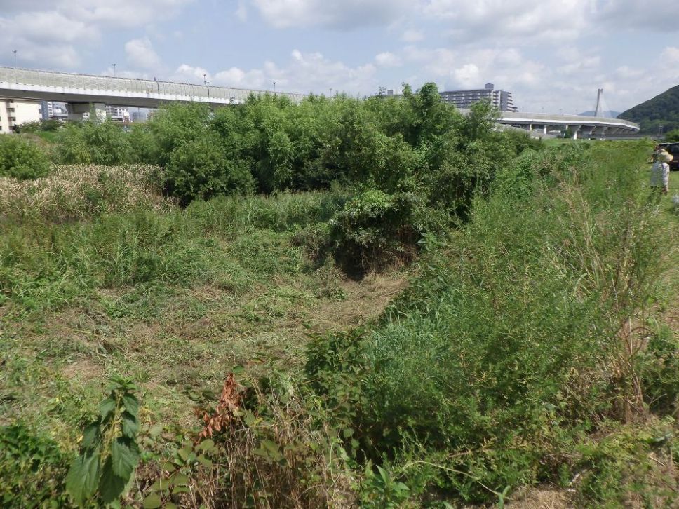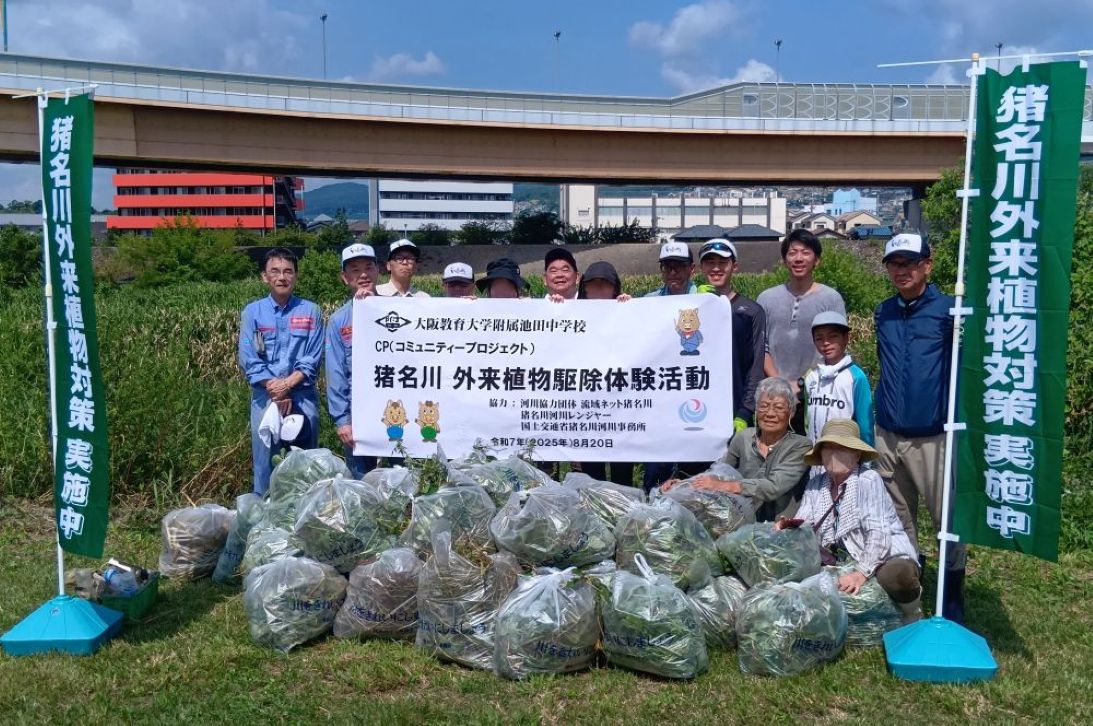 活動レポート 大阪教育大学附属池田中学校の総合学習の一環で、7月末に、中学生、河川協力団体、河川レンジャー、猪名川河川事務所の4者協働で河川敷の外来植物駆除を行いました。(活動報告へ)