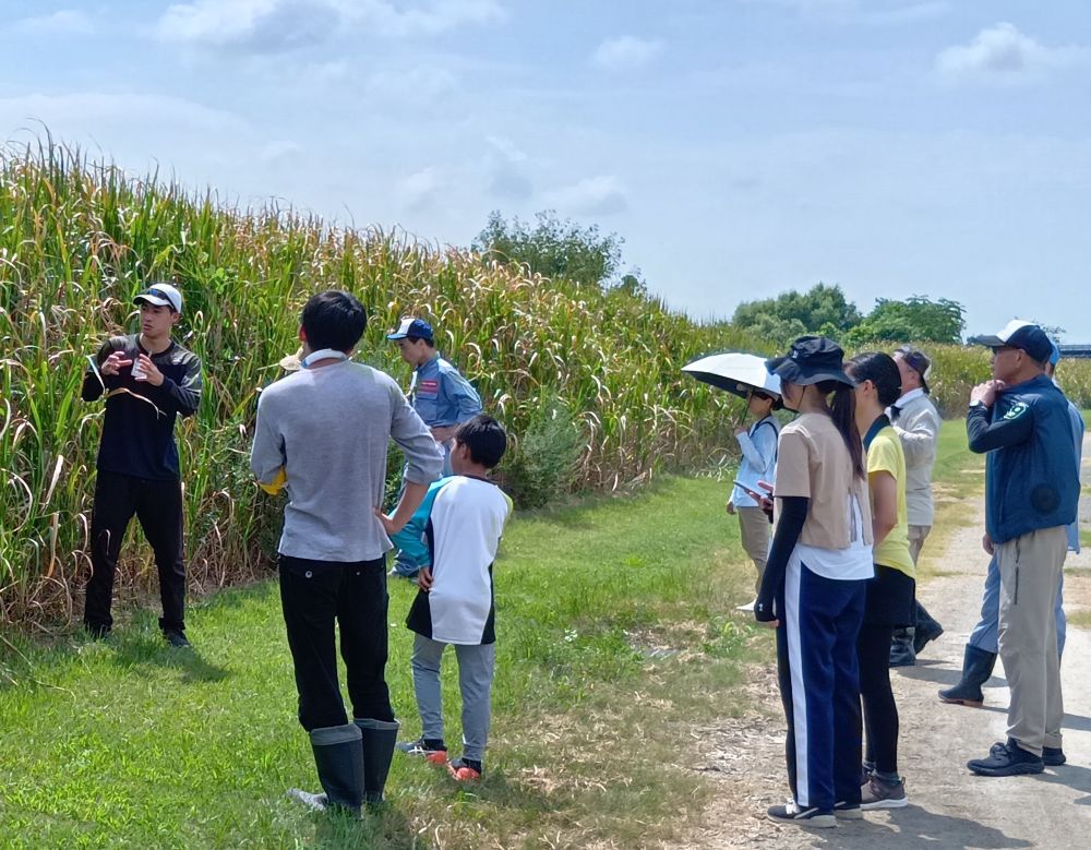 現地での作業後には、流域ネット猪名川が普段から手入れを行っている川西市の東久代運動公園河岸に移動しました。流域ネットの方から説明をいただき、外来植物駆除等の日頃の活動の成果によりオギ原が元気に育っている様子をみんなで観察しました。このような在来種の草地では、カヤネズミやオオヨシキリなど、河川ならではの貴重な生き物が暮らすことができます。猪名川の外来植物を減らしていき、在来の動植物が暮らせる豊かな環境を増やしていきたいですね。