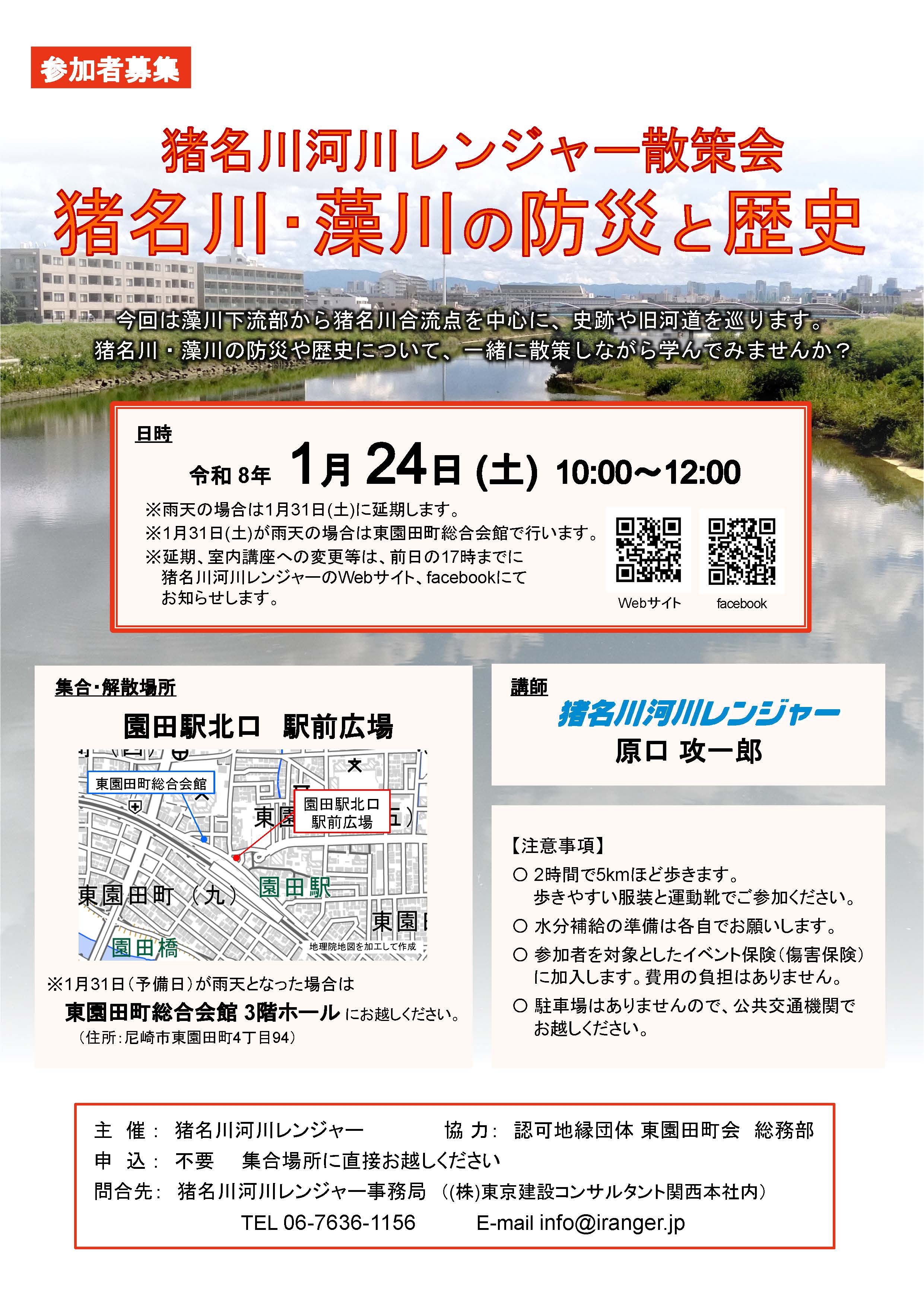 こうした痕跡をたどりながら、原口レンジャーが防災や歴史について解説する「猪名川・藻川の防災歴史散策会」を開催しました。参加した方々からは、「猪名川を知れてよかった」「ふだんよく通る道に歴史があることがわかり、興味深かった」「土地を読み解きながら歩くのはとても楽しい」等の感想をいただきました。