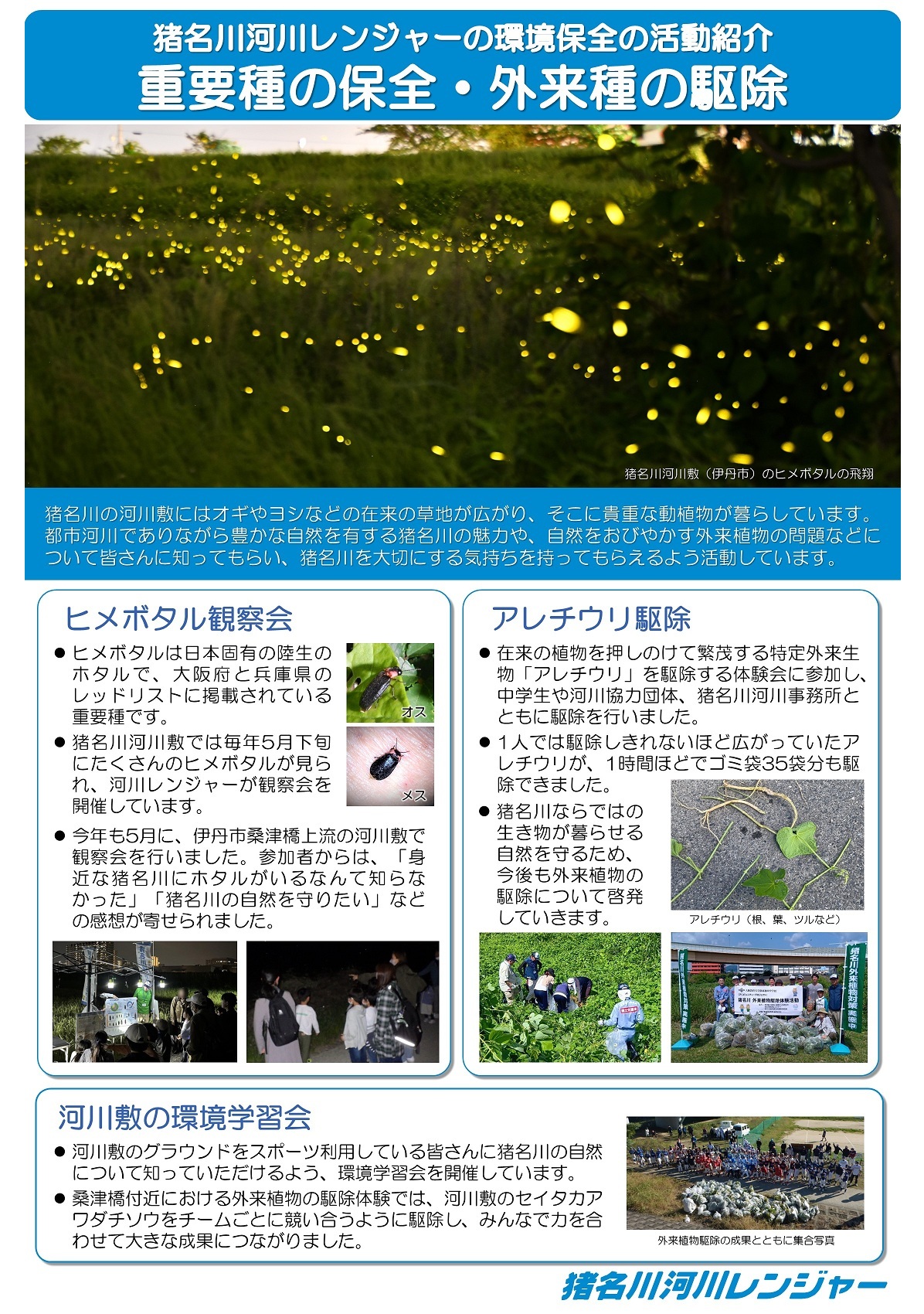 今年は、猪名川河川レンジャーの生物多様性に関連する活動を紹介するポスターを出展しました。生涯学習センターに来られた多くの方にポスターを見ていただくことができました。