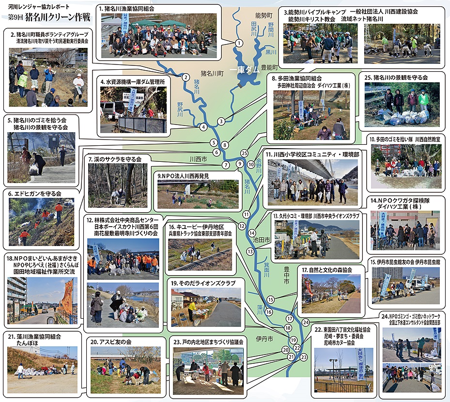 猪名川漁業協同組合、清流猪名川を取り戻そう町民運動実行委員会、猪名川町職員ボランティアグループ、能勢川バイブルキャンプ、能勢川キリスト教会、一般社団法人川西建設協会、流域ネット猪名川、水資源機構一庫ダム管理所、猪名川のゴミを拾う会、猪名川の景観を守る会、エドヒガンを守る会、渓のサクラを守る会、多田漁業共同組合、ダイハツ多田地区クリーンアップ実行委員会、周辺自治会、NPO法人川西再発見、多田のゴミを拾い隊、川西自然教室、川西小学校区コミュニティ推進協議会・環境部、日本ボーイスカウト川西第6団、林株式会社中央商品センター、南花屋敷最明寺川づくりの会、久代小学校区コミュニティ推進協議会・環境部、 川西中央ライオンズクラブ、NPO法人クワガタ探検隊、ダイハツ工業(株)、伊丹市昆虫館友の会、伊丹市昆虫館、キユーピー伊丹地区、兵庫県トラック協会東部支部青年部会、自然と文化の森協会、NPO法人まいどいんあまがさき、NPO法人やじろべえ、社会福祉法人さくらんぼ、園田地域 福祉作業所交流、そのだライオンズクラブ、阪急園田駅周辺まちづくり協議会、アスビ友の会、藻川漁業共同組合、たんぽぽ、東園田町八丁目文化福祉協会、戸の内町北地区まちづくり協議会、NPO法人ゴミンゴ・ゴミ拾いネットワーク、社団法人全国上下水道コンサルタント協会関西支部、尼崎・夢まち・委員会、尼崎市カヌー協会